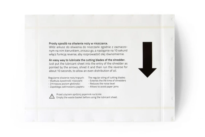 Arkusze formatu A5 rozprowadzające olej na nożach tnących niszczarek.