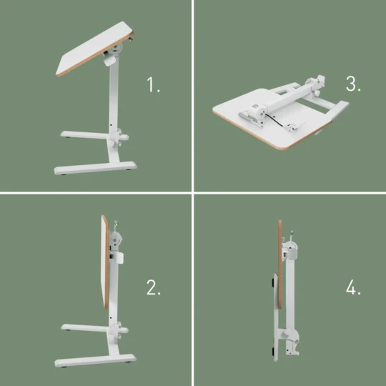 - Pomysłowo zaprojektowane ergonomiczne biurko pod laptopa do pracy w pozycji siedzącej i stojącej idealnie pasuje do małych przestrzeni. Umożliwia elastyczną i tymczasową pracę, a ponieważ można je złożyć do szerokości 16 cm, jest łatwe do przenoszenia i rozstawiania w dowolnym miejscu.