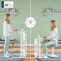 Biurko, opatrzone certyfikatami: niemieckiego Instytut Zdrowia i Ergonomii IGR, bezpieczeństwa GS i TÜV, ma płynną pneumatyczną regulację wysokości (74-109 cm), która umożliwia znalezienie idealnej, ergonomicznej pozycji siedzącej lub stojącej.