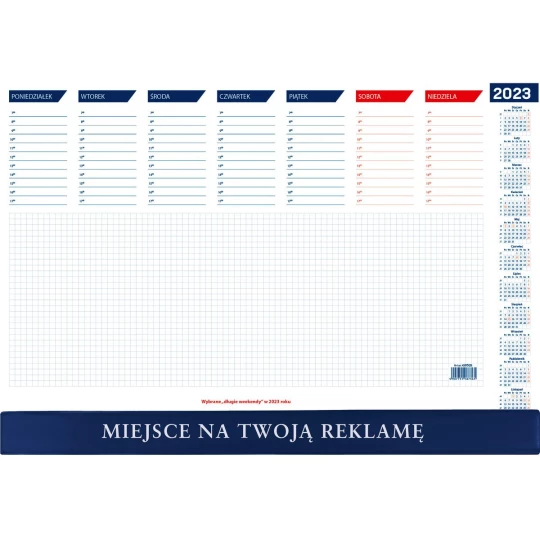 Praktyczny podkład na biurko z dużym obszarem do notowania, drukowany na papierze białym. Uchylna listwa PCV w kolorze granatowym w dolnej części kalendarza. Na listwie istnieje możliwość wykonania nadruku reklamowego na obszarze 470 x 30 mm.