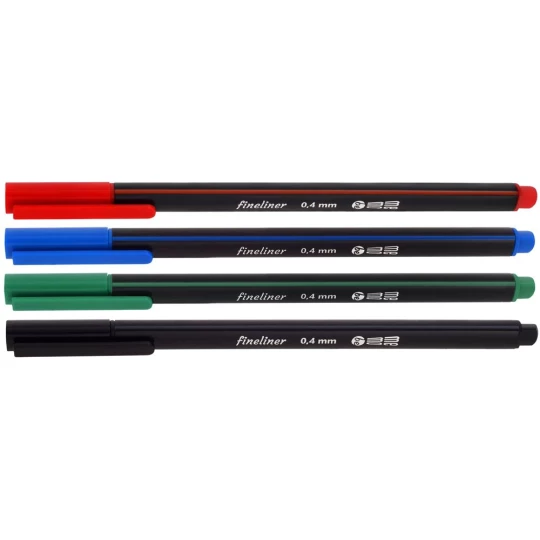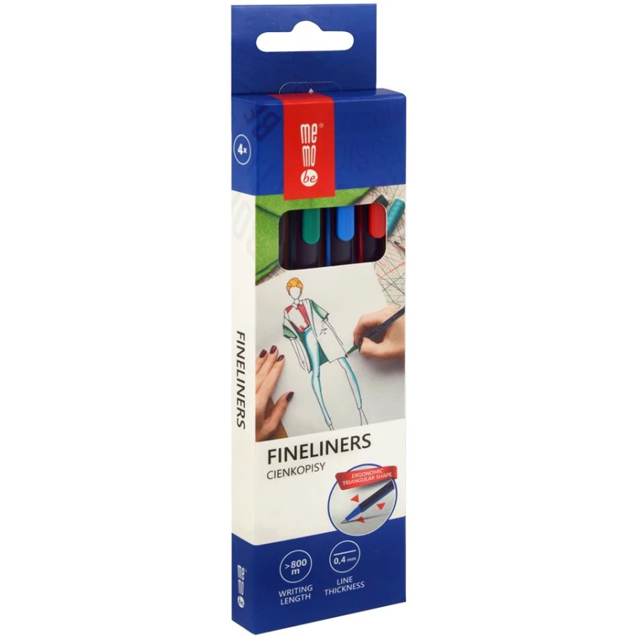 Zestaw cienkopisów MemoBe w 4 kolorach w kartonowym pudełku z eurozawieszką. Cienkopisy z końcówką F o rozmiarze 0,4mm. Obudowa w trójkątnym kształcie ułatwiającym utrzymanie prawidłowego i wygodnego chwytu. Miękka, płynna linia pisania o długości powyżej 800m. Dostępne zestawy: 4, 6 lub 10 kolorów.