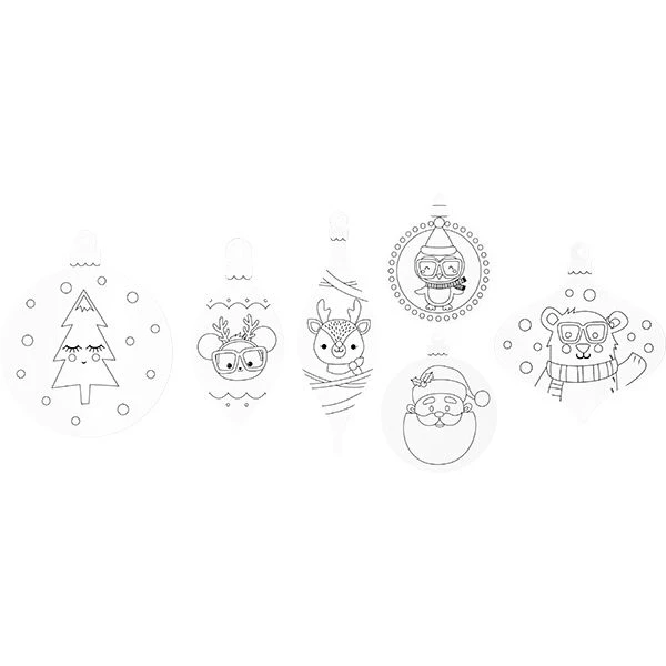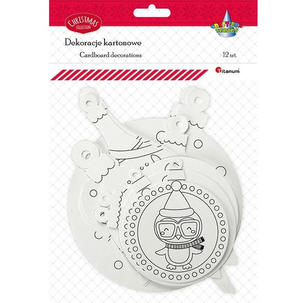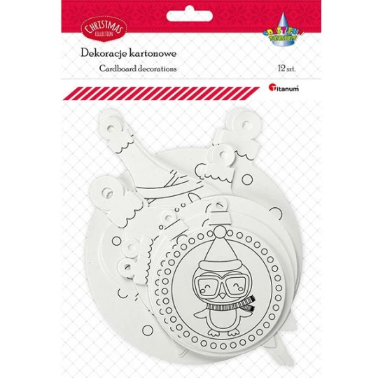 Kartonowe zawieszki w kształcie bombek do wykończenia dowolną techniką. Można je pomalować farbami, kredkami czy flamastrami, a także wykleić ozdobnymi papierami, w zestawie 6 wzorów, każdy po 2 sztuki. Wymiary: od 80 do 165 mm, kolor: biały, blister: 12 szt.