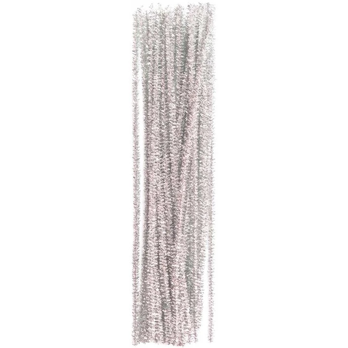 Zestaw 40 sztuk miękkich, pluszowych drucików dekoracyjnych w perłowym, mieniącym się w świetle srebrnym kolorze. Każdy drucik ma długość 30 cm i średnicę 6 mm, co czyni je idealnymi do tworzenia różnorodnych ozdób, biżuterii oraz dekoracji przestrzennych.