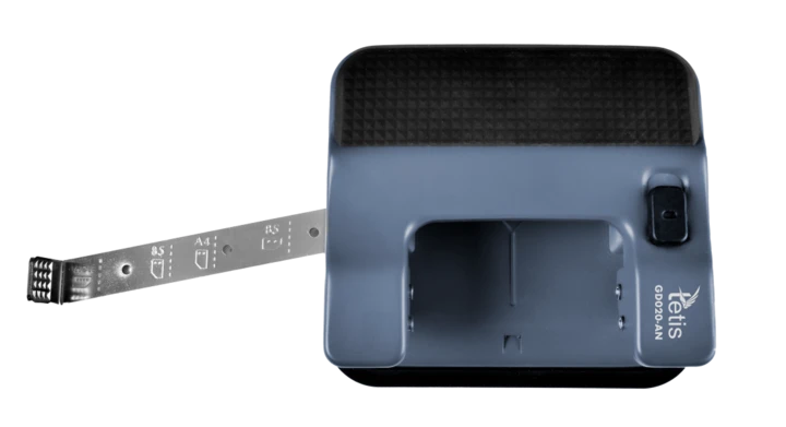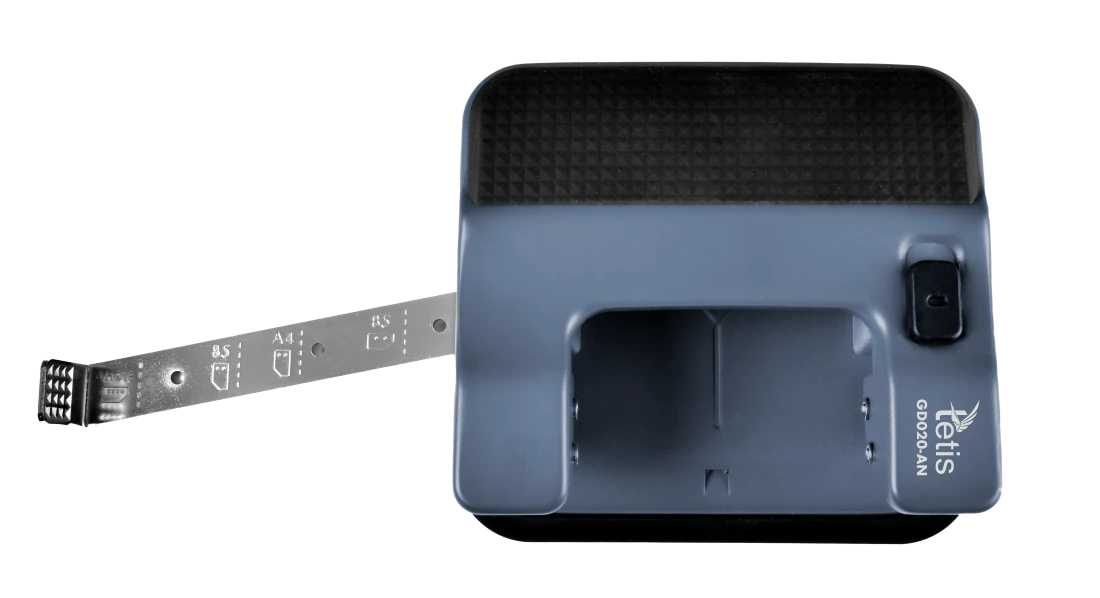 - Posiada pojemnik na konfetti z magnetycznym zamknięciem, metalowy ogranicznik formatu, blokadę dźwigni oraz wskaźnik środka strony.