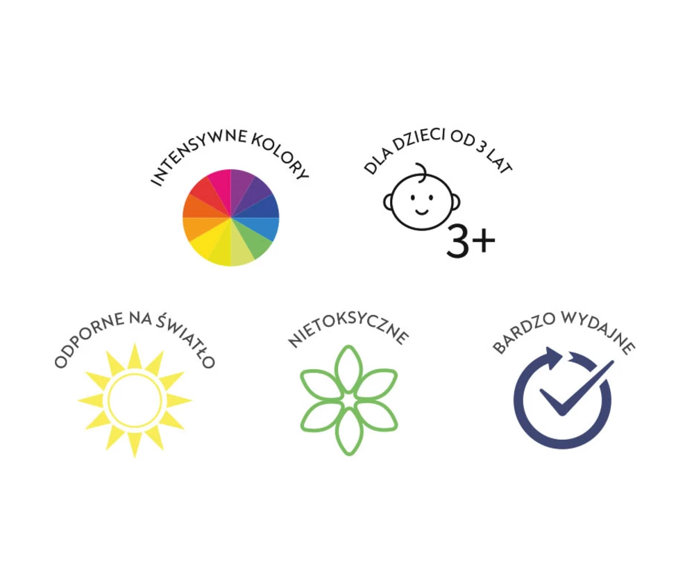 - Są nietoksyczne, bezpieczne dla dzieci i latwo zmywają sie z malych rączek.