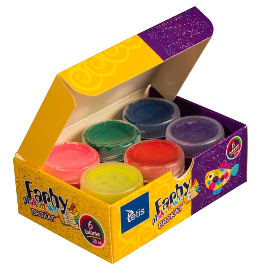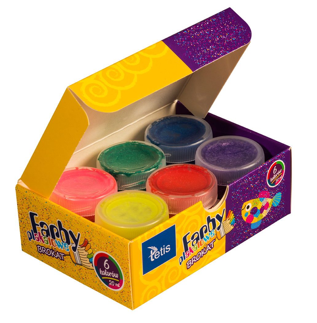 Farby plakatowe brokatowe, odporne na światło, zmywalne.