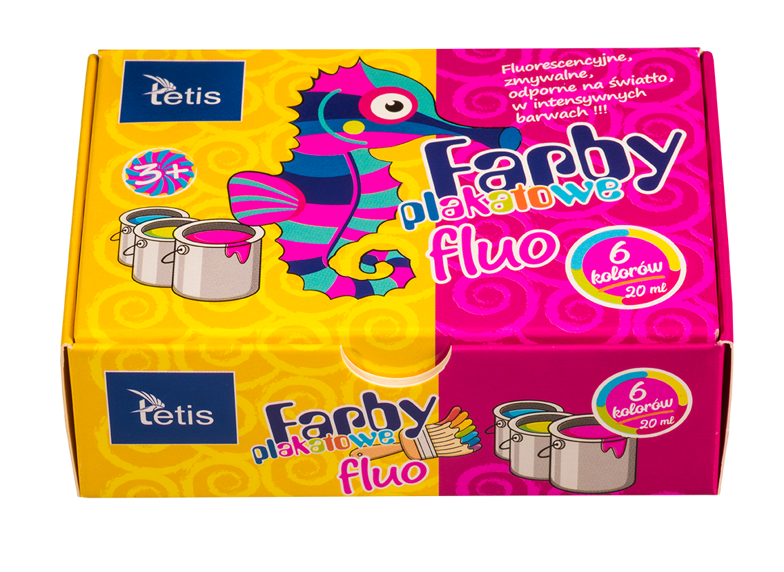 Farby plakatowe fluorescencyjne w intensywnych barwach, odporne na światło, zmywalne.