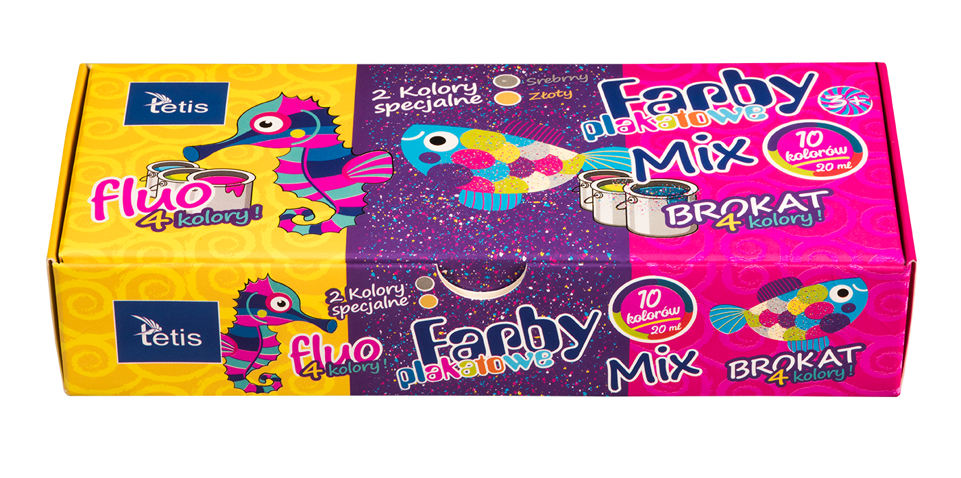 Farby plakatowe mix, zestaw zawiera: 4 kolory fluorescencyjne, 4 kolory brokatowe, 2 kolory specjalne: srebrny, złoty. Odporne na światło, zmywalne.