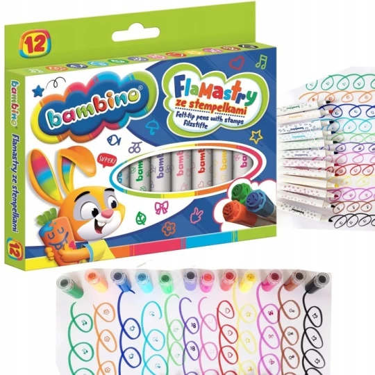 Zestaw flamastrów ze stempelkami marki Bambino to doskonały wybór dla dzieci ceniących sobie kreatywność i poszukiwanie nowych form wyrazu artystycznego. Każdy z 12 flamastrów wyposażony jest w unikalny stempelkowy wzór, co daje mnóstwo możliwości do twórczego ozdabiania rysunków, kartek okolicznościowych czy zaproszeń. Intensywne barwy flamastrów sprawią, że każdy projekt nabierze wyrazistości, a ich długa żywotność zapewni wiele godzin zabawy. Produkty są łatwo zmywalne, co pozwala na błyskawiczne usunięcie przypadkowych śladów z rąk czy ubrań.