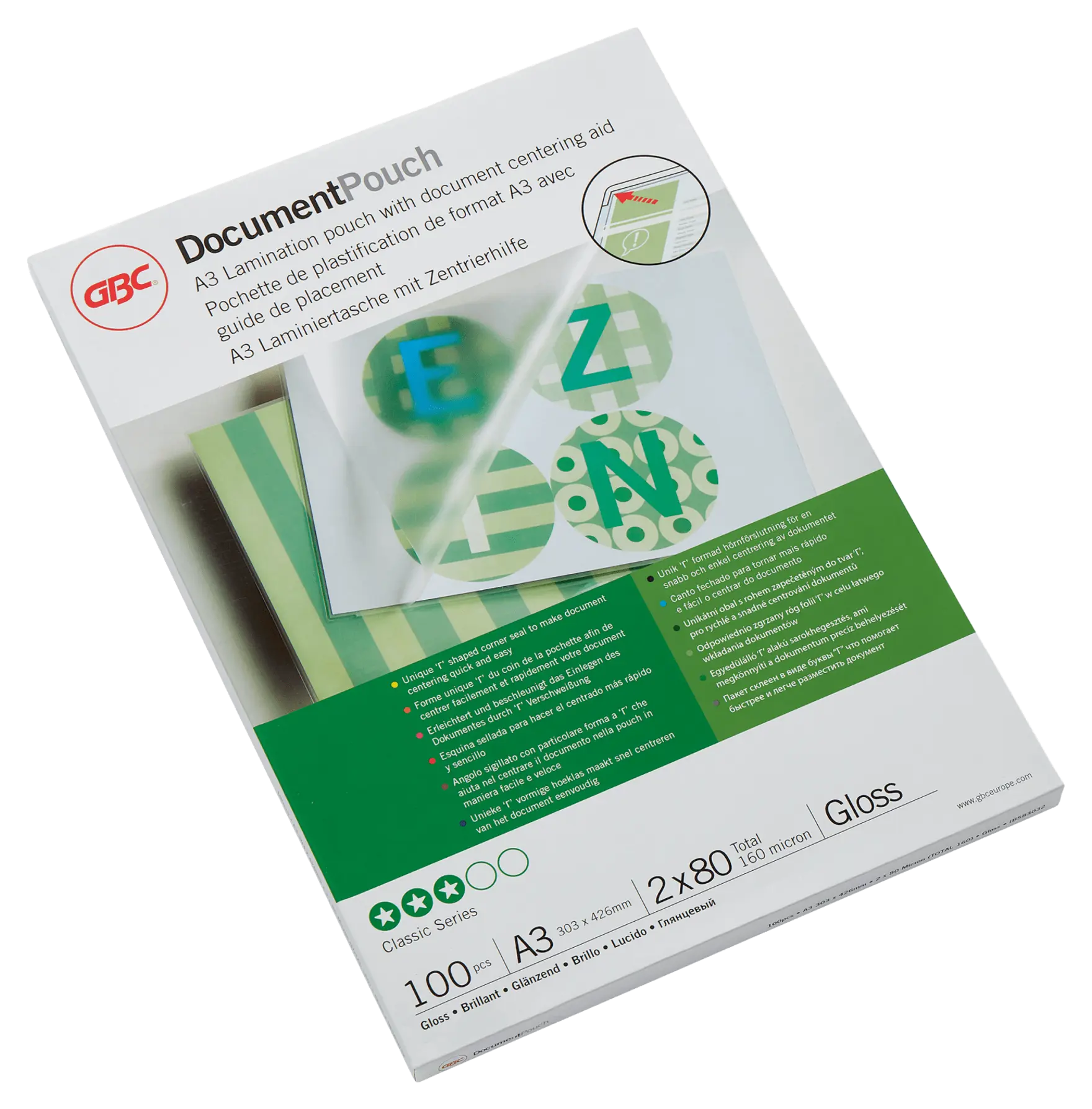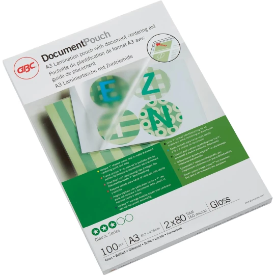 Folie do laminowania dokumentów GBC A3 zapewniają ochronę cennych dokumentów. Te folie do laminowania mają błyszczące wykończenie i są bardzo elastyczne. Okładki mają standardową grubość 2x80 mikronów.