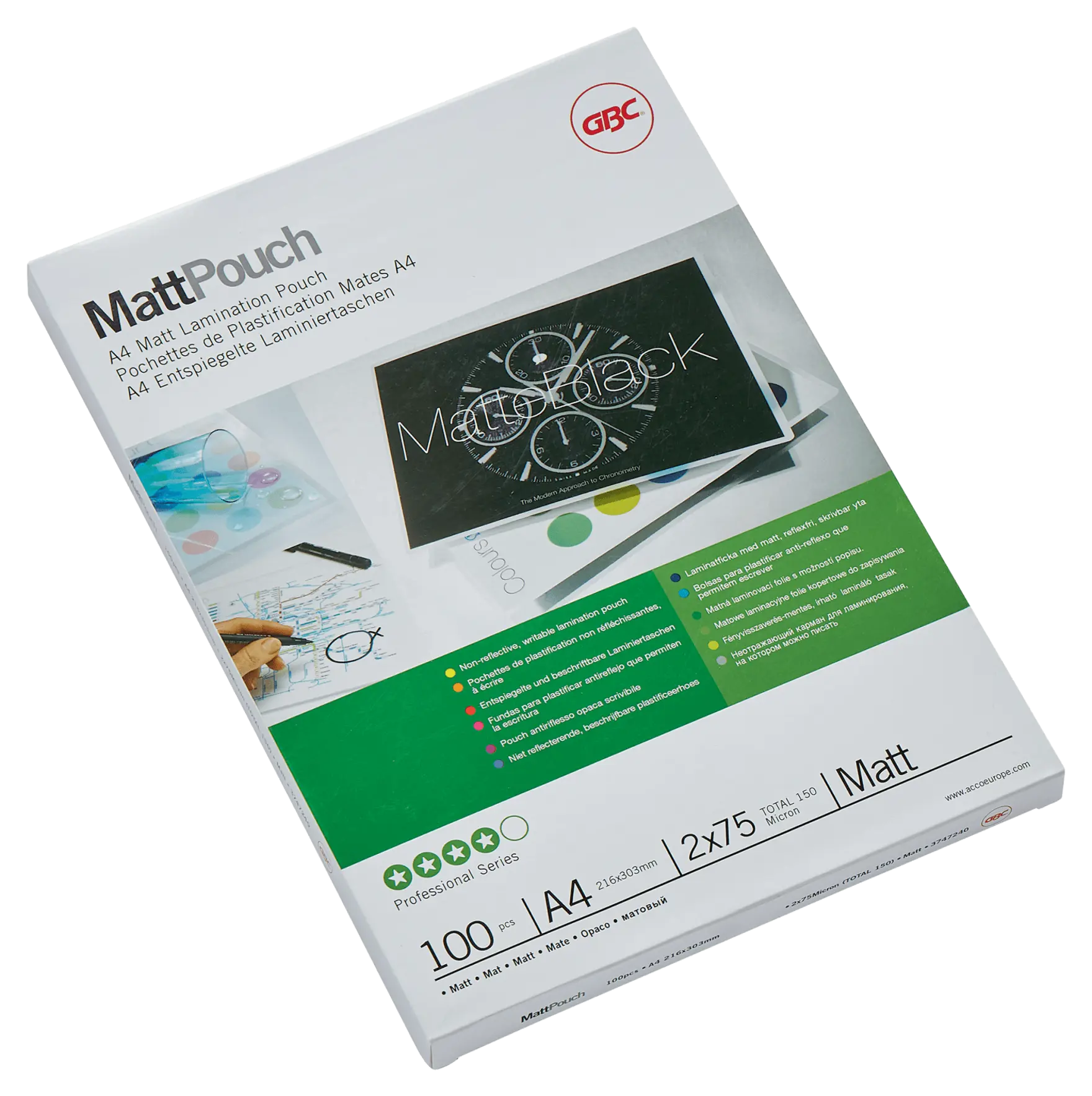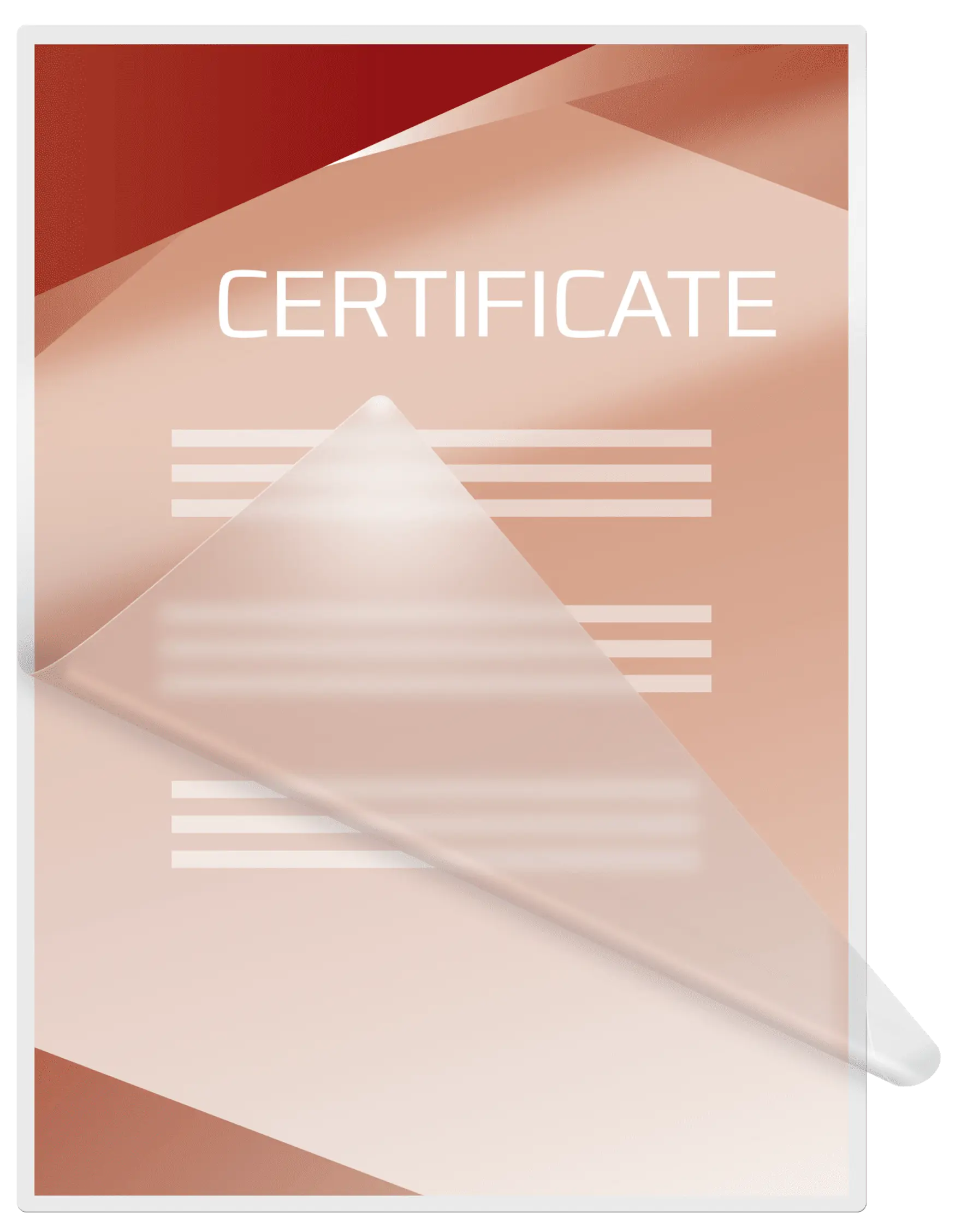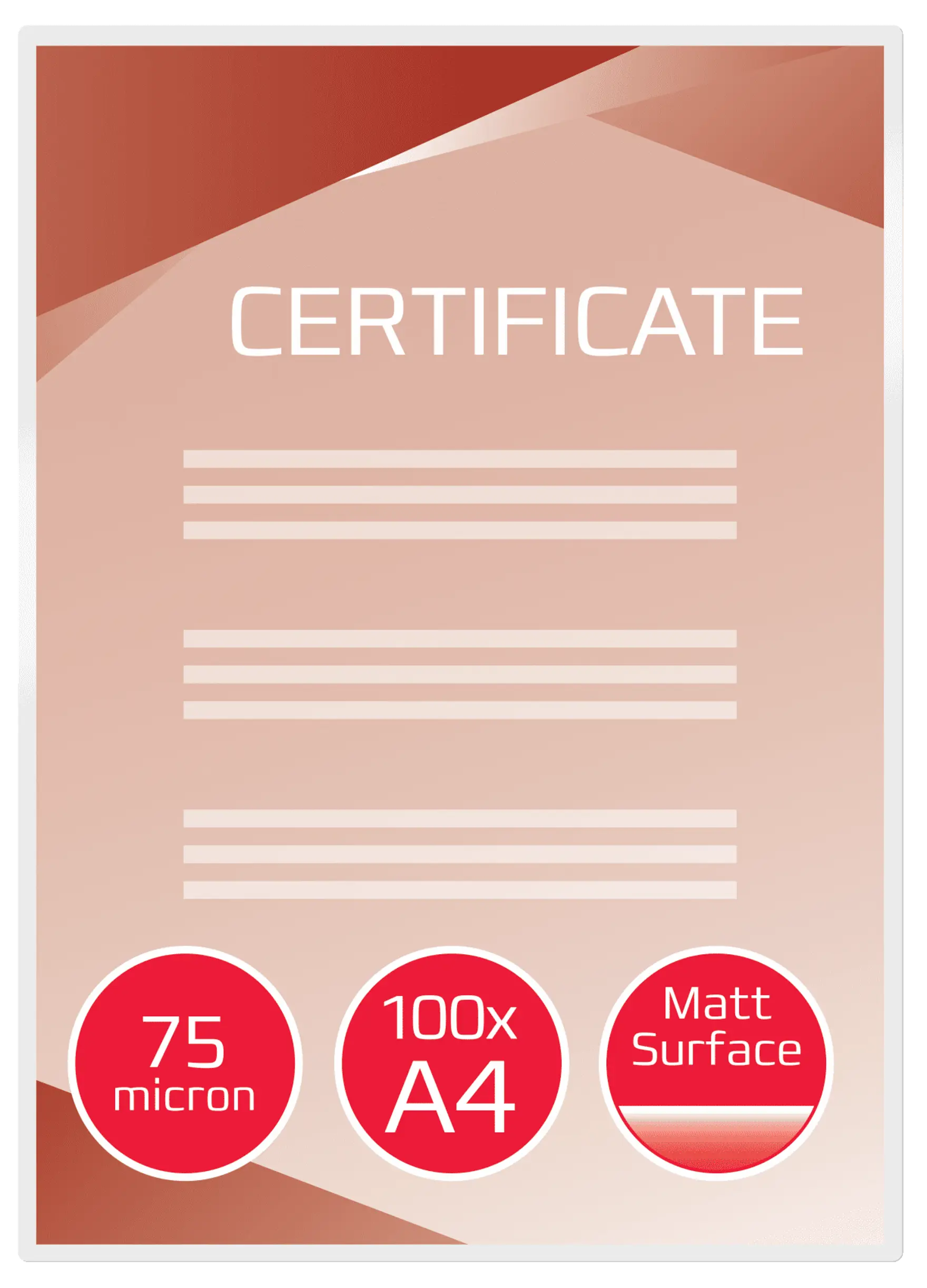 Wytrzymały matowy laminat przylegający do obu stron arkuszy chroni często używane dokumenty, minimalizuje odblaski i umożliwia pisanie po jego powierzchni. 2 x 75 mikronów. Format A4. Opakowanie: 100 szt.