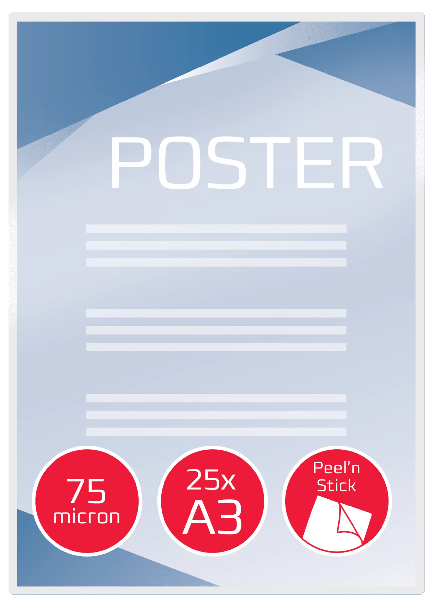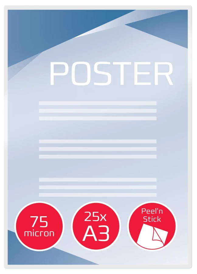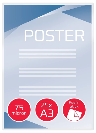 Folie do laminacji Peel'n Stick nadają się do błyskawicznego tworzenia profesjonalnego, przyciągającego wzrok oznakowania. Spodnia warstwa klejąca przylega do większości powierzchni, w tym szkła, metalu i tektury. Wystarczy odkleić papier podkładowy, aby odsłonić warstwę samoprzylepną. Folie błyszczące o grubości 75 mikronów. Format A3. Opakowanie: 25 sztuk.