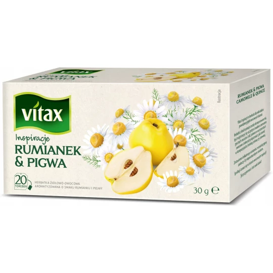 Linia herbat Vitax Inspiracje, tak została skomponowana żebyś mógł cieszyć się aromatem ziół w połączeniu z soczystością przepysznych owoców. Linia została stworzona specjalnie dla miłośników prawdziwej głębi owocowych doznań. Połączenie wyrazistej pigwy z delikatnym rumiankiem to zestawienie, które zaskoczy cię niepowtarzalnym smakiem.