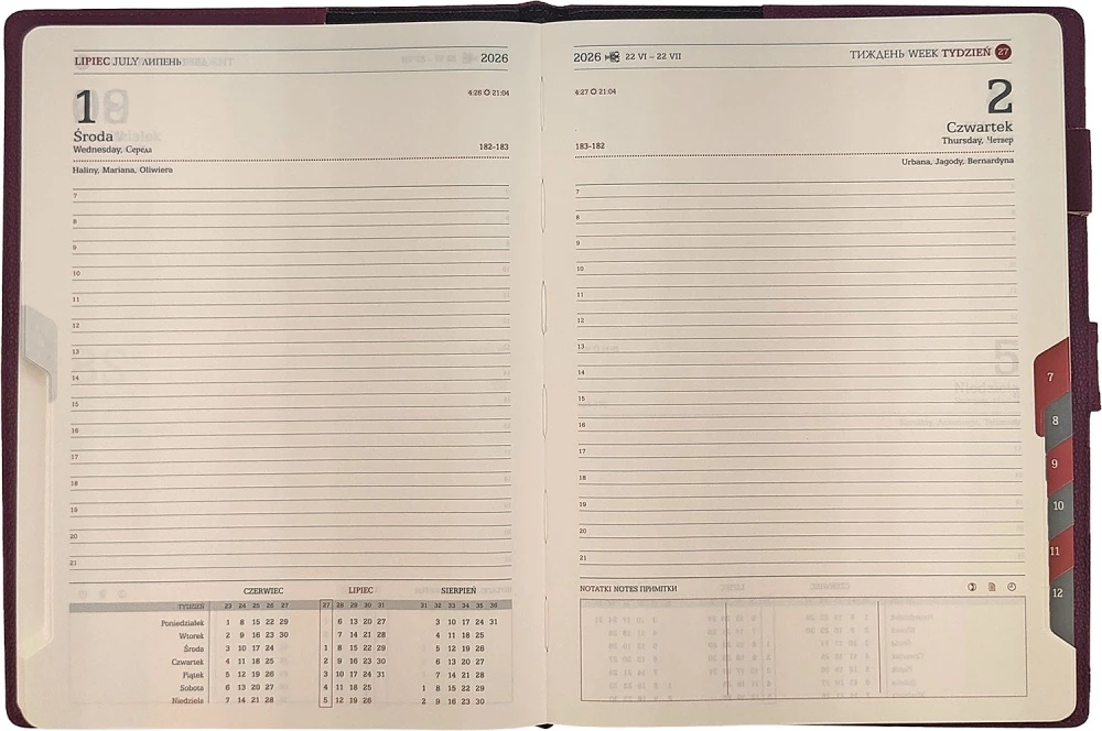 - Rozkład: dzień na 1 stronie, Wycięte registry, ilość kartek 352.