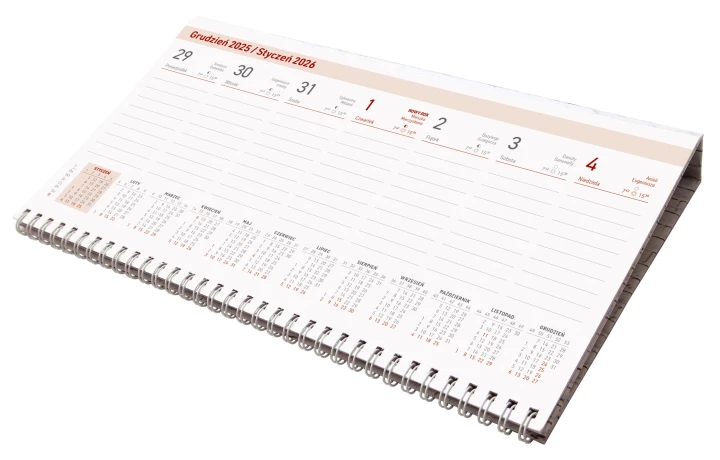 W kalendarzu zaznaczone święta i daty imienin. Kalendarz posiada wygodną kartonową podstawkę. Istnieje możliwość założenia indywidualnej okładki.