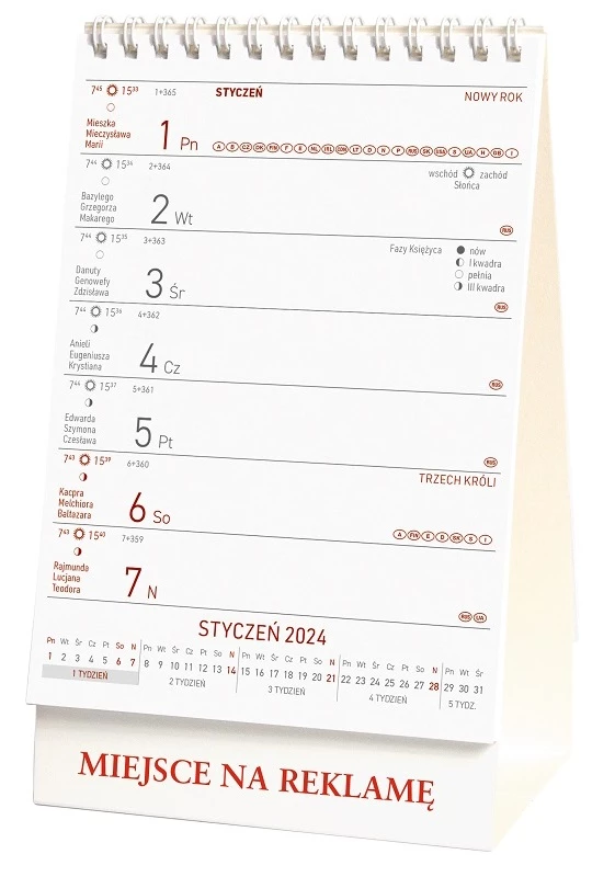 Wygodny kalendarz stojący na biurko z przejrzystym kalendarium w ukladzie tygodniowym, z duzym obszarem do notowania .