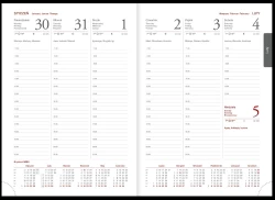 Estetyczny kalendarz stojący na biurko z przejrzystym kalendarium w układzie trzymiesięcznym. W dolnej części kartonowej podstawki istnieje możliwość wykonania nadruku reklamowego na obszarze o wymiarach 110 x 15 mm. Istnieje możliwość założenia indywidualnej okładki. W kalendarzu zaznaczone święta i daty imienin.