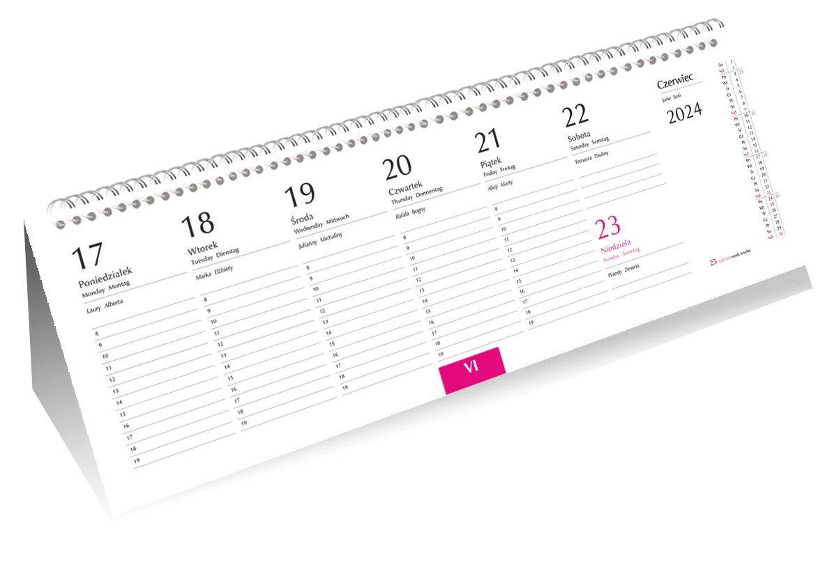 - układ kalendarium: 1 tydzień - 1 strona