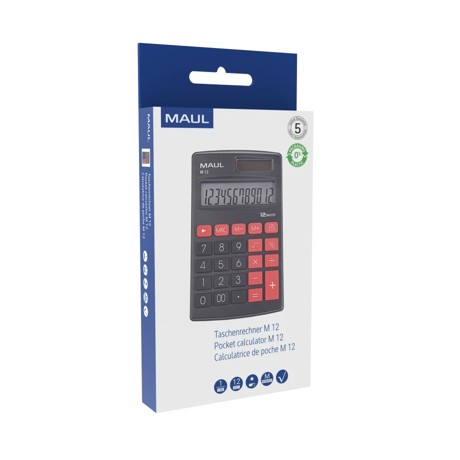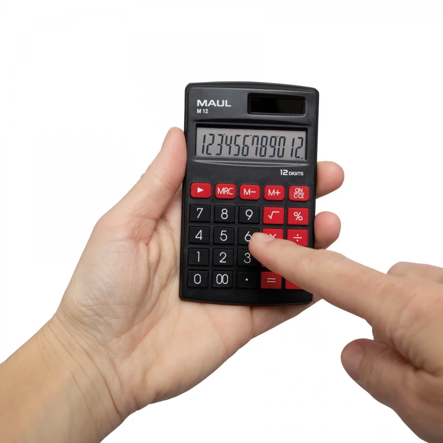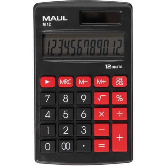 Kieszonkowy kalkulator MAUL M 12 w kolorze czarnym z duzym, 12-pozycyjnym wyświetlaczem LCD. Niezawodny, stylowy i dokladny. Wyjątkowo plaski: mieści sie w kazdej torbie, teczce, tornistrze czy plecaku. Sprawia, ze zycie staje sie kolorowe! Dostepny w 3 modnych wersjach kolorystycznych. Szybsze wyszukiwanie: przyciski funkcyjne i numeryczne w róznych kolorach. Kompaktowy rozmiar i zaokrąglone krawedzie sprawiają, ze dobrze lezy w dloni. Z antypoślizgowymi, gumowymi przyciskami. Energooszczedny, dzieki podwójnemu zasilaniu baterią i baterią sloneczna, z funkcją automatycznego wylączania. Wyposazony w 3 przyciski pamieci, obliczanie pierwiastków kwadratowych i procentów. Gwarancja: 5 lat. Wymiary: 11,5 x 6,9 x 1,0 cm. Zawiera jedną baterie (LR1130). Ekologiczne opakowanie z tektury, bez uzycia plastiku, z eurozawieszką.