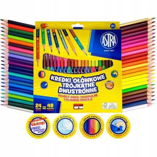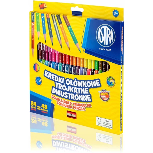 Kredki ołówkowe dwustronne trójkątne 24szt=48 kolorów z temperówką 312116004 ASTRA