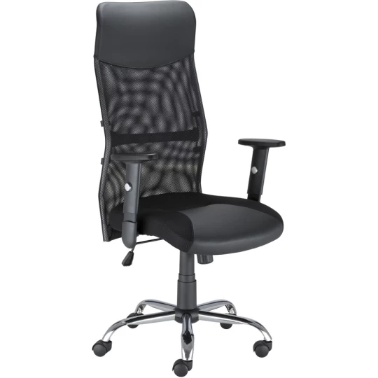 Krzesło obrotowe HIT czarne__ szerokie, komfortowe siedzisko i ergonomicznie _wyprofilowane oparcie__ wysokie oparcie__ oparcie i siedzisko tapicerowane połączeniem tkaniny _siatkowej i imitacji skóry oraz tkaniny w kolorze czarnym__ możliwość swobodnego kołysania się__ możliwość blokady siedziska i oparcia w pozycji _do pracy regulacja siły oporu oparcia__ regulowana wysokość krzesła__ regulowane podłokietniki z miękkimi nakładkami lub stałe podłokietniki__ podstawa chromowana__ samohamowne kółka do powierzchni dywanowych _w standardzie__ *HIT R - regulowane podłokietniki z miękkimi nakładkami