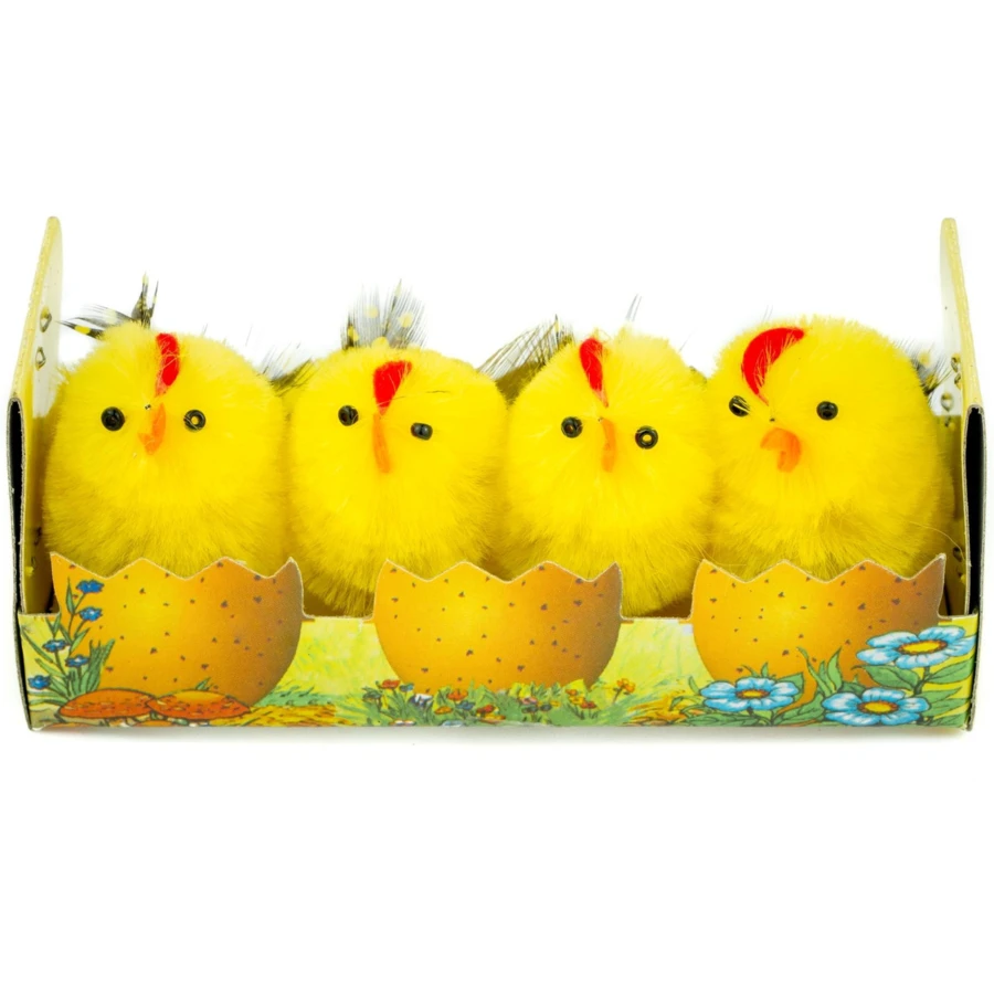 Kurczaki wielkanocne, mix wzorów. Wysokość 4,5 cm. 1 box zawiera 4 szt.