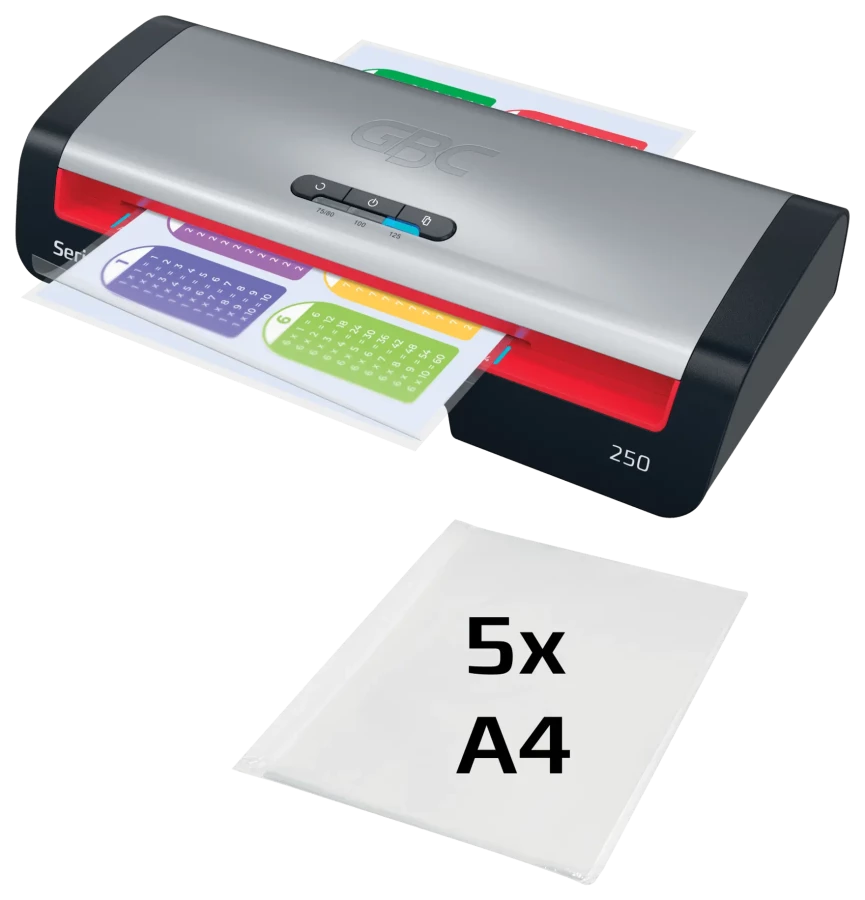 Model GBC 250 A4 to niezawodne i wydajne urządzenie przeznaczone do codziennego użytkowania w biurze. Został zaprojektowany dla różnych środowisk pracy - łączy wydajność z łatwością obsługi. Zapewnia krótki, 1-minutowy czas nagrzewania i laminuje kartkę A4 foliami o grubości 75 mikronów w zaledwie 36 sekund, co pozwala na szybkie wykonanie zadań w biurze. Intuicyjny panel sterowania oferuje trzy ustawienia grubości folii w zakresie od 75 do 125 mikronów, zapewniając elastyczność wyboru dla różnych typów dokumentów.