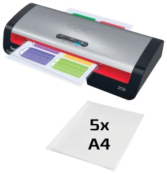 - Sprzedawany wraz z pakietem startowym, zawierającym 5 folii do laminacji w formacie A4 (grubość 75 mikronów).