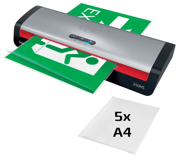 Model GBC 250HS A3 to wydajne i niezawodne urządzenie do laminacji przeznaczone do codziennego użytkowania. Został zaprojektowany dla różnych środowisk pracy - zapewnia szybką laminację. łącząc wydajność z łatwością obsługi. Zwiększ produktywność i skróć czas laminacji o 30%, korzystając z folii do laminacji GBC HighSpeed. Zapewnia krótki, 1-minutowy czas nagrzewania i laminuje kartkę A4 foliami o grubości 75 mikronów w zaledwie 36 sekund, co pozwala na szybkie wykonanie zadań w biurze. Intuicyjny panel sterowania oferuje trzy ustawienia grubości folii w zakresie od 75 do 125 mikronów, zapewniając elastyczność wyboru dla różnych typów dokumentów. Panel posiada również przycisk cofania zapobiegający zacięciom, który ułatwia usuwanie źle podanych folii.
