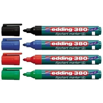 Marker do flipchartów, wyposażony w tusz na bazie wody o neutralnym zapachu, który zapobiega przebijaniu tuszu na drugą stronę. Do ponownego napełniania. Wyposażony w specjalny system cap-off, który umożliwia pozostawienie markera bez zatyczki nawet do 6 tygodni bez ryzyka wyschnięcia. Okrągła końcówka o grubości linii pisania 1,5 - 3 mm (380) lub ścięta o grubości linii pisania 1 - 5 mm (383).