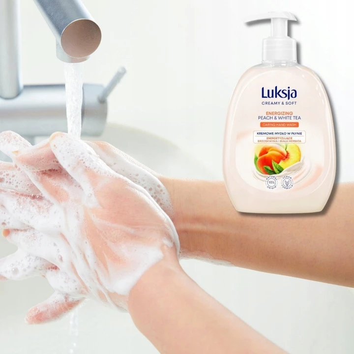 Luksja Creamy & Soft Kremowe Mydło w Płynie Brzoskwinia i Biała Herbata 500 ml Delikatne mydło o zapachu brzoskwini i białej herbaty skutecznie oczyszcza skórę, pozostawiając ją miękką, gładką i świeżo pachnącą. Zawiera 93% składników pochodzenia naturalnego, ma wegańską i biodegradowalną formułę oraz pH przyjazne skórze, dzięki czemu idealnie nadaje się do codziennego stosowania przez całą rodzinę.