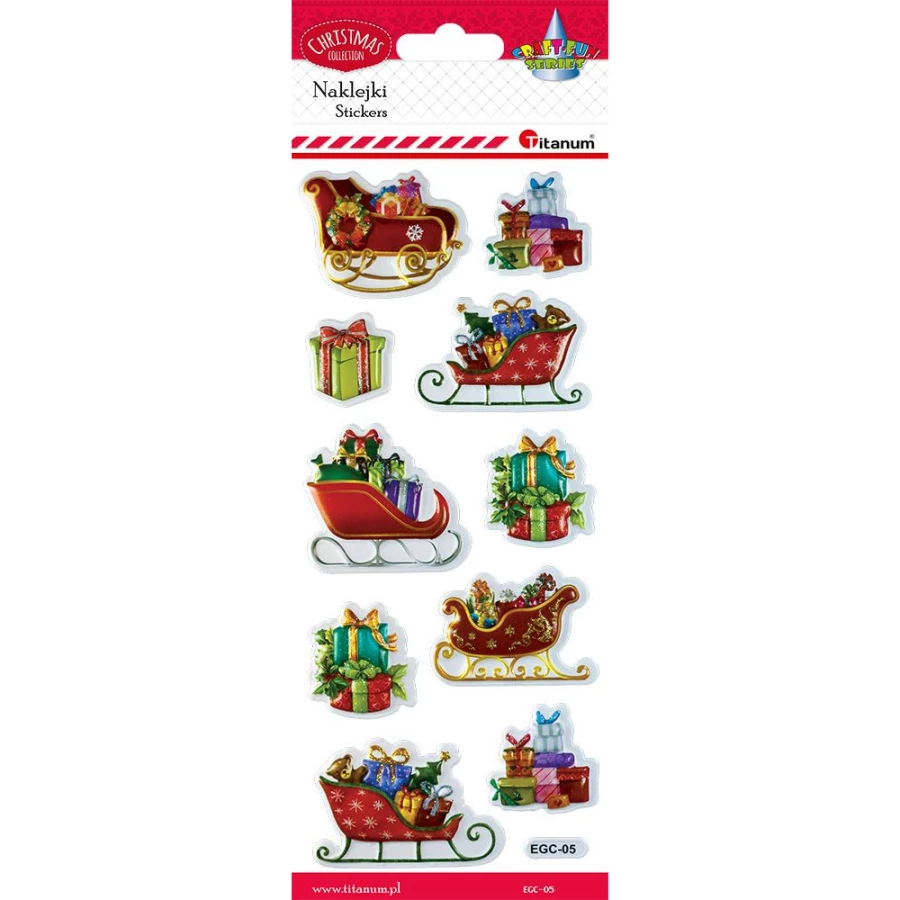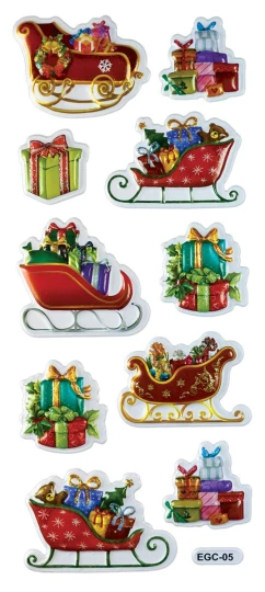 Naklejki wypukłe miękkie. Wzór: sanie i prezenty. 10 sztuk.