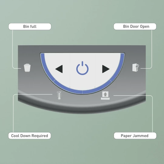 - Intuicyjny wyświetlacz LED wyświetla komunikaty ostrzegawcze o zapełnieniu pojemnika, otwartych drzwiczkach, przegrzaniu lub przeciążeniu urządzenia.