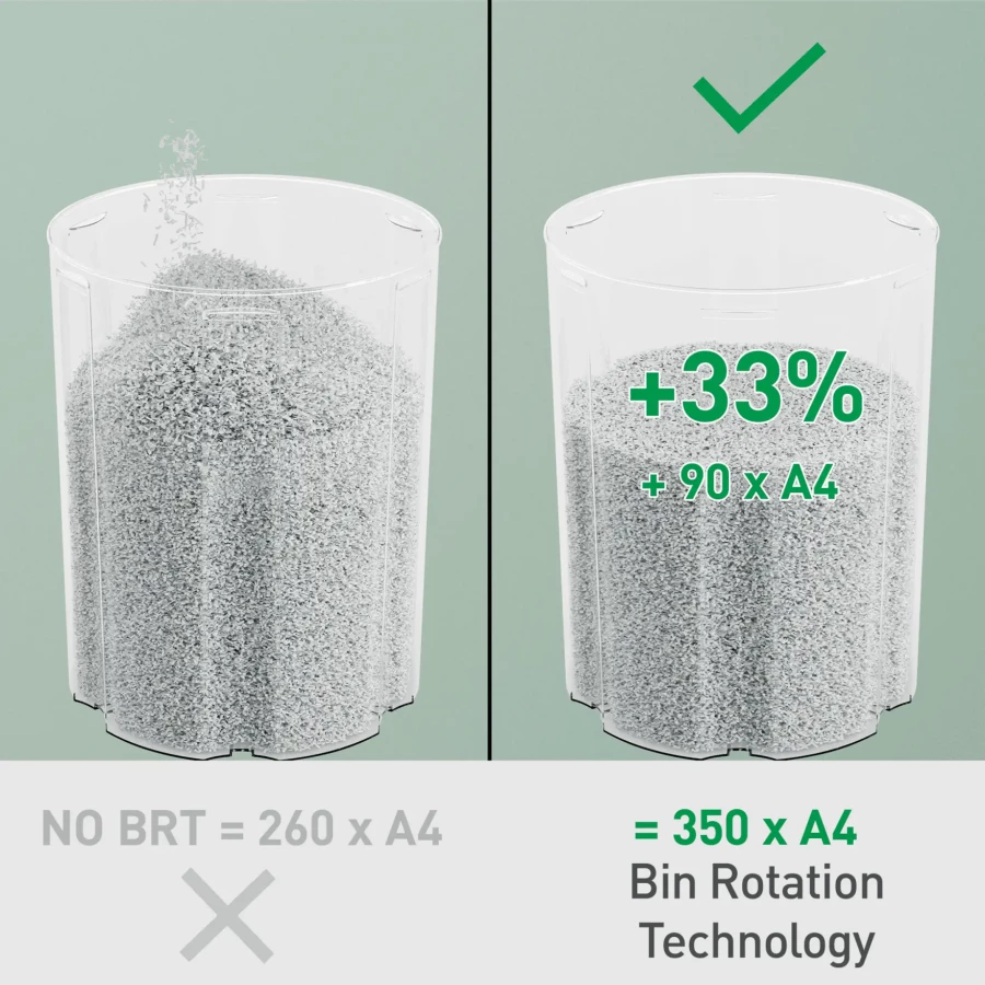 Obrotowy pojemnik na ścinki zapewnia równomierne rozprowadzanie ścinków, zapobiegając tworzeniu się piramidy, co pozwala zmieścić w nim dodatkowych 90 kartek A4, zanim będzie wymagał opróżnienia. Technologia obrotowego pojemnika eliminuje konieczność wyciągania lub potrząsania pojemnikiem; wskaźnik „pojemnik pełny” aktywuje się tylko wtedy, gdy pojemnik osiągnie 100% wypełnienia. Dzięki dużemu, 22-litrowemu pojemnikowi na ścinki, który pomieści do 350 pociętych kartek A4, zapewnia mniej przerw w pracy. Podświetlany na niebiesko pojemnik na ścinki i intuicyjny obrotowy wyświetlacz LED wyświetlają klarowne, łatwe do zrozumienia komunikaty ostrzegawcze, np. o zapełnienia pojemnika czy otwartych drzwiczkach, dzięki którym proces niszczenia jest prosty i wydajny.
