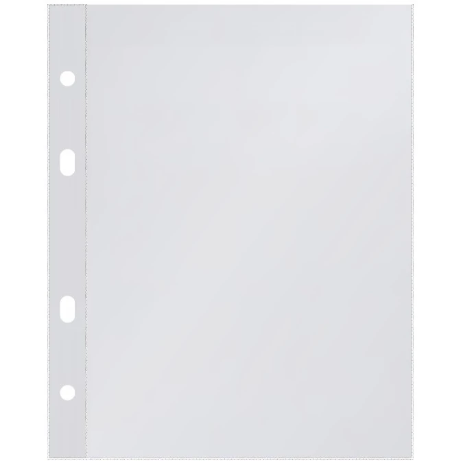 Przód i tył z przezroczystej twardej folii PVC typu 0,15; zgrzew w kształcie litery "U"; boczna perforacja umożliwiająca wpięcie do segregatora z dowolnym ringiem;