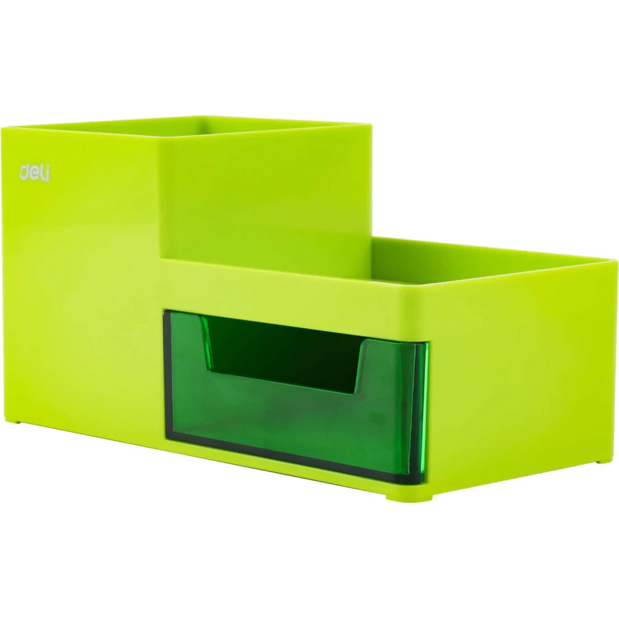 Ten zielony organizer na biurko o wymiarach 175 x 90 x 92 mm to designerskie połączenie minimalistycznej formy z energetycznym kolorem. Wykonany z trwałych materiałów, gwarantuje długą żywotność. Idealnie sprawdzi się zarówno w pracy, jak i w domu, dzięki licznych przegrodom, które umożliwiają przechowywanie niezbędnych przyborów. Dodatkowo, posiada zamykaną szufladę, pomagającą w organizacji miejsca pracy i zachowaniu porządku. Dzięki solidnemu opakowaniu z grubą folią zabezpieczającą o aksamitnym wykończeniu oraz opakowaniu jakim jest karton, produkt dotrze do Ciebie w nienaruszonym stanie.