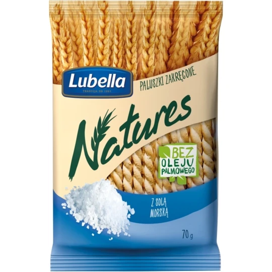 Paluszki Lubella Natures to przekąska na bazie zbóż o unikalnym, zakręconym kształcie bez dodatku oleju palmowego. To doskonały wybór do pracy, na podróż, imprezę czy spotkanie w gronie przyjaciół. W ofercie dwa warianty smakowe: z solą morską oraz z czosnkiem.