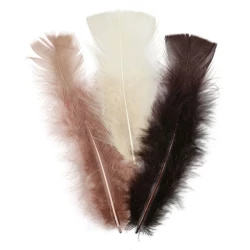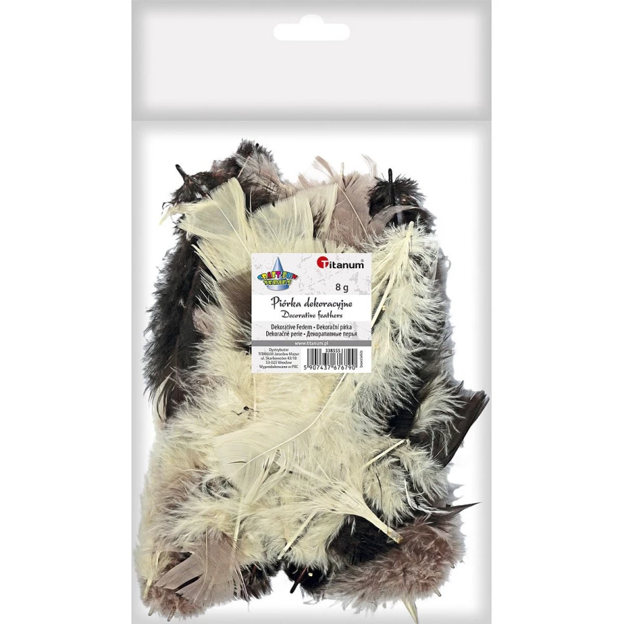 Piórka dekoracyjne, kolory: beżowy, ciemnobrązowy, jasnobrązowy. Blister 8 g.
