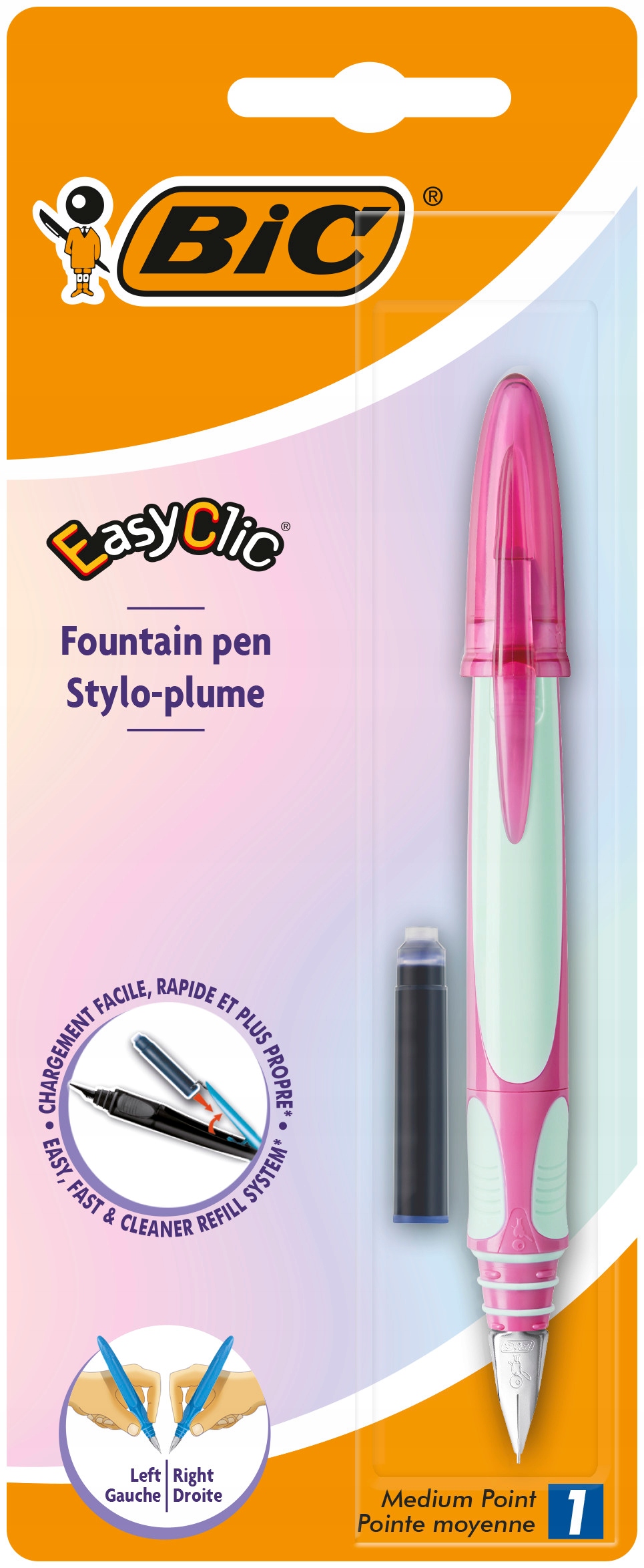 Pióro wieczne BIC EasyClic Standard z wymazywaczem i zapaswymi nabojami. Zostało zaprojektowane z myślą o użytku w szkole. Trójkątny chwyt ułatwia prawidłowe ułożenie palców i jest świetny zarówno dla osób prawo- jak i leworęcznych. Posiada innowacyjny, łatwy w obsłudze mechanizm bocznej wymiany krótkich naboi z atramentem. Zestaw zawiera pióro wieczne z wymazywaczem i 6 nabojami.