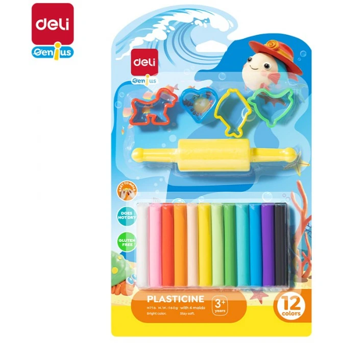 Plastelina Deli EH716 12 kolorów - zestaw z foremkami i wałkiem
