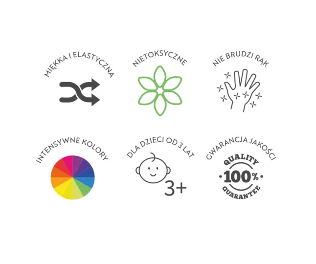 Intensywne kolory rozbudzają wyobraLnie i inspirują do tworzenia niezwyklych prac. Plastelina pozostaje miekka, a zbudowane figurki mozna rozebrac i ponownie wykrozystac do nowych pomyslów. Odkryj produkt najwyzszej jakości - bezpieczny i nietoksyczny. Zrównowazony dobór barwników sprawia, ze plastelina nie brudzi rąk, a kolory pozostają intensywne.