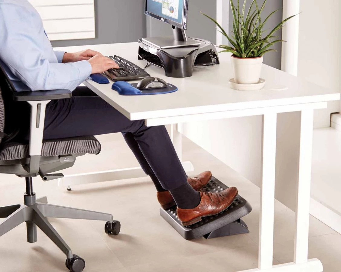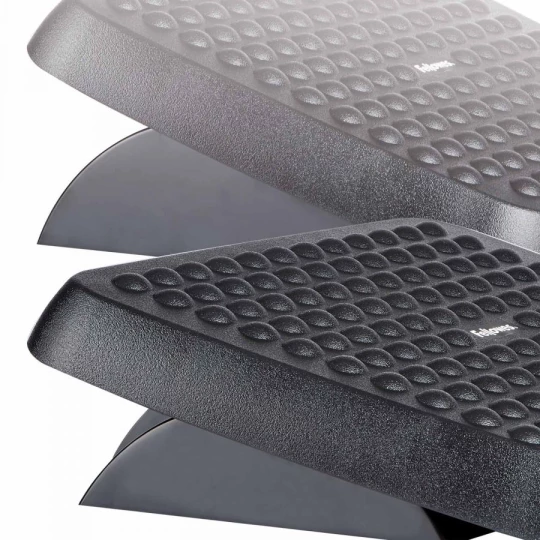 - Podnóżek ergonomiczny Fellowes posiada regulację wysokości (2 pozycje: 85 i 105mm) oraz kąta nachylenia (płynnie do 25°)