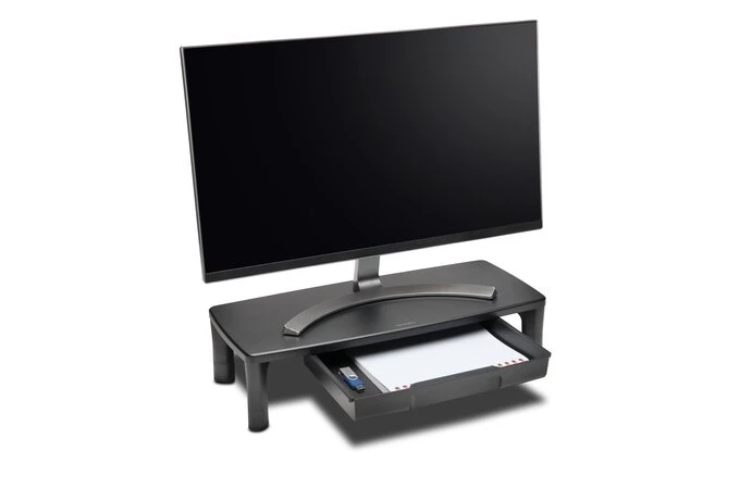 Podstawka pod monitor z szufladą Kensington SmartFit zapewnia ergonomiczne korzyści wynikające z ustawienia ekranu na optymalnej dla oczu wysokości, a takze dodatkowe miejsce do przechowywania akcesoriów biurowych.