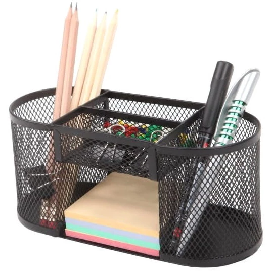 Wielofunkcyjny przybornik na biurko wykonany z metalowej siatki pokrytej lakierem.