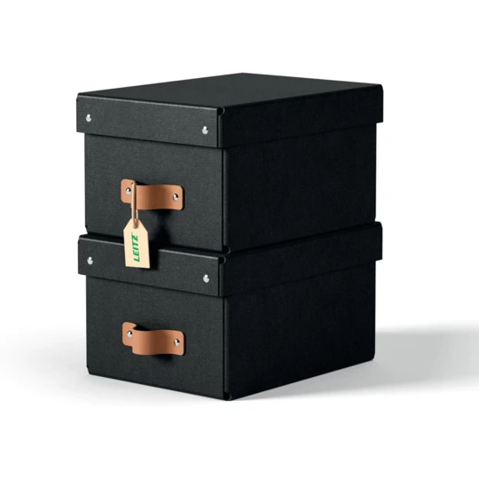 Zadbaj o porządek i dobre samopoczucie, tworząc z pomocą tekturowych pudełek Leitz Puro z pokrywkami uporządkowaną przestrzeń z miejscami do przechowywania. Zestaw dwóch dekoracyjnych pudełek o pojemności 7 litrów pomoże Ci utrzymywać porządek i przechowywać rzeczy w stylowy sposób, w domu i w biurze. Te wysokiej jakości pudełka, które można ustawiać jedne na drugich, co pozwala zaoszczędzić miejsce, idealnie nadają się do przechowywania dokumentów A5, niewielkich akcesoriów elektronicznych, płyt CD/DVD, zabawek i innych przedmiotów.