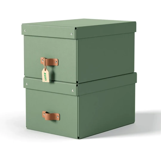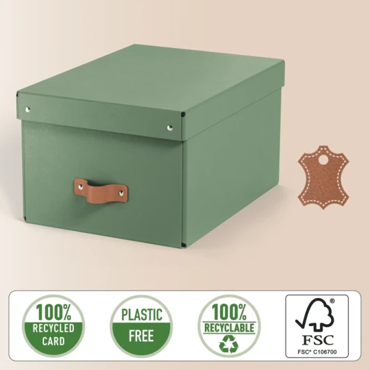 - Zestaw dwóch średniej wielkości pudełek do przechowywania z pokrywkami w nowoczesnym, minimalistycznym stylu doskonale uzupełni wnętrze Twojego domu i biura; wykonane są z tektury z certyfikatem FSC w 100% pochodzącej z recyklingu.