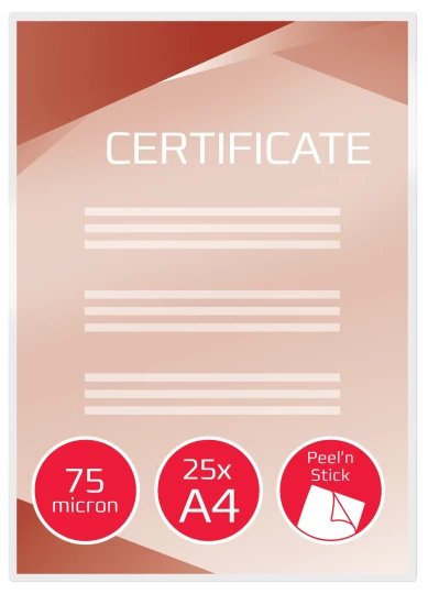 Samoprzylepne folie do laminacji Peel'n Stick idealnie nadają się do szybkiego przygotowania profesjonalnego i wyróżniającego się oznakowania. Folia przykleja się do większości powierzchni łącznie ze szkłem, metalem i tekturą. Wystarczy odkleić ochronną warstwę papieru, aby umożliwić naklejenie folii. Folie 2 x 75 mikronów, z połyskiem. Format A4. Opakowanie: 25 szt.