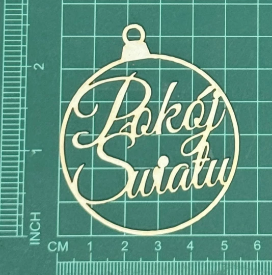 Bombka z napisem Pokój Światu Scrapek - tekturka wycięty laserem z beermaty o grubości 1,5 mm. Wymiary jak na zdjęciu. Kod produktu to: LBA00610