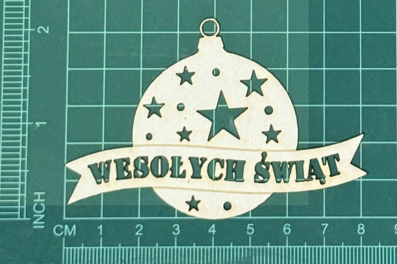 Bombka z napisem wesołych świąt Scrapek - tekturka wycięty laserem z beermaty o grubości 1,5 mm. Wymiary jak na zdjęciu. Kod produktu to: LBA00618
