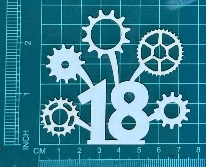 Cyfra 18 z trybikami Scrapek - tekturka wycięty laserem z beermaty o grubości 1,5 mm. Wymiary jak na zdjęciu. Kod produktu to: LBA00917